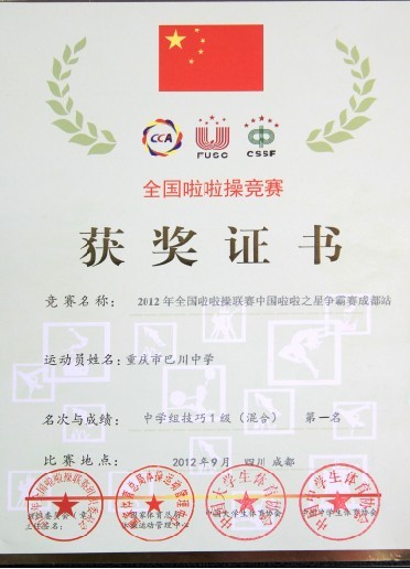 9月22-23日,“2012年全國啦啦操聯賽中國啦啦之星爭霸賽”在成都隆重舉行,我校2014級技巧啦啦操參賽代表隊全力以赴,再創佳績,奪得中學組技巧啦啦操第一名。