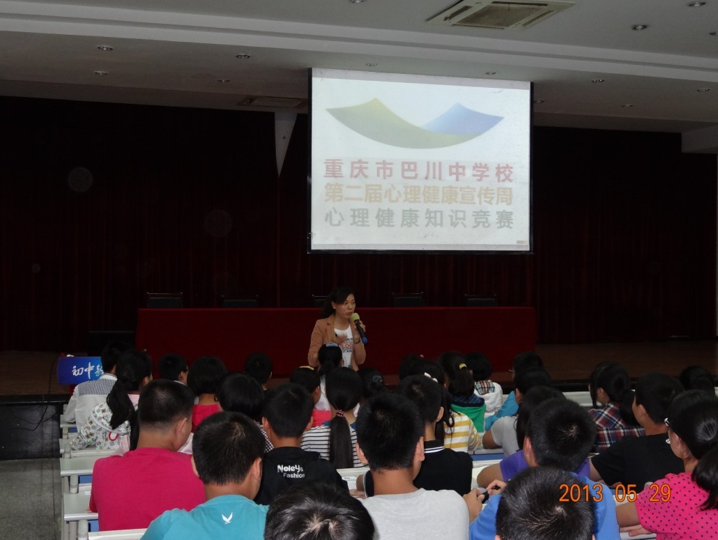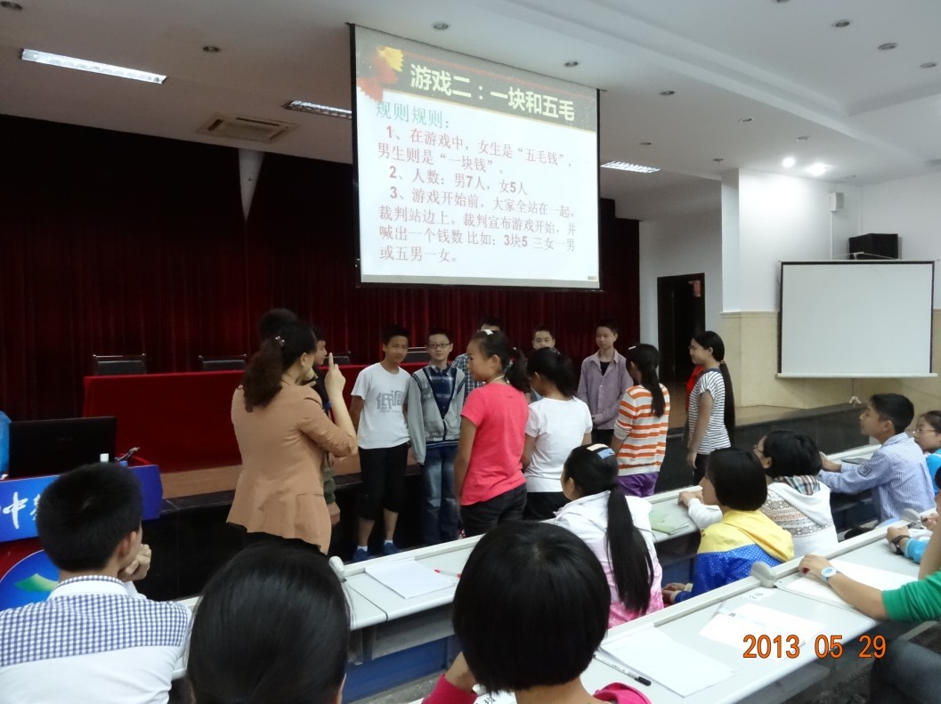 5月29日下午,在各班初賽的基礎上各派4名學生代表齊聚階梯教室,我們以《幸福拍手歌》熱身全場后,“一元,五毛”的團輔活動告訴同學們要正確處理男女生的關系,然后分別以個人和班級展開了心理健康知識決賽,同學們積極參與,也表現出不凡的知識功底。