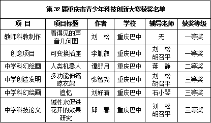 我校積極組織學(xué)生參賽并榮獲銅梁區(qū)團(tuán)體一等獎(jiǎng)。劉松、胡召平、李倩、沈小麗、蔣靜、詹媛媛、曹甄燕、石小琴8位老師獲得“優(yōu)秀指導(dǎo)老師”稱號(hào);銅梁區(qū)大賽中學(xué)生作品共有32件獲科技創(chuàng)新大賽一等獎(jiǎng),9件獲二等獎(jiǎng),3件獲三等獎(jiǎng);市級(jí)大賽中學(xué)生作品2件獲重慶市市級(jí)創(chuàng)新大賽一等獎(jiǎng),1件獲得二等獎(jiǎng),3件獲三等獎(jiǎng)。