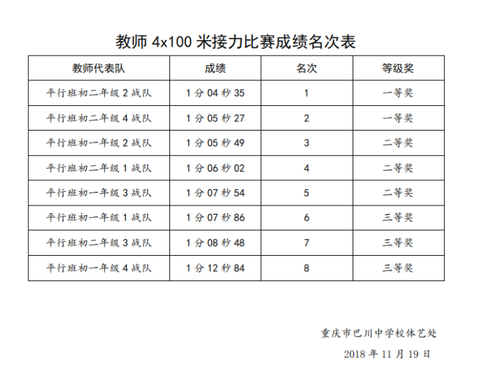 本屆運動會既是對學(xué)校體育水平的一次集中檢閱,也是學(xué)校素質(zhì)教育、體育活動的一次集中展示,是對學(xué)校體育工作、師生精神風(fēng)貌的一次檢閱,更是對運動員身體素質(zhì)、競技水平、心理承受力等綜合素質(zhì)的考驗,同時又是各參賽班級集體意識、團隊合作意識、競爭意識、頑強拼搏精神的一次大展示。今后,巴川教育的每一次活動,都將立足于活動本身,深入挖掘活動的育人價值,彰顯巴川教育的育人理念,引領(lǐng)重慶市乃至全國的基礎(chǔ)教育!