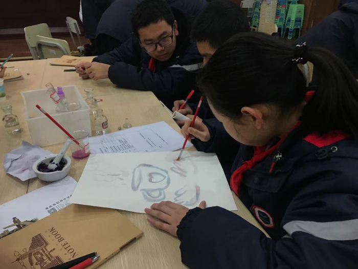 第二堂是章磊老師帶來量子中學(xué)牛頓班課程《神奇的變色畫》,章老師以獨特新穎的拍手活動以及閱讀無字信開場,點燃了學(xué)生的激情與興趣,讓學(xué)生通過品嘗花生的種皮,發(fā)現(xiàn)本節(jié)課的主角---花青素,展示不同土壤栽培的花擁有不同的顏色,得出實驗原理:花青素遇到酸或堿會發(fā)生顏色變化。邀請了化學(xué)老師廖丹丹,現(xiàn)場示范指導(dǎo)如何從紫甘藍(lán)中提取花青素,邀請在場的其他老師參與制作變色畫,為學(xué)生安全使用酸和堿保駕護(hù)航,活動結(jié)束后小組代表展示小組成果。