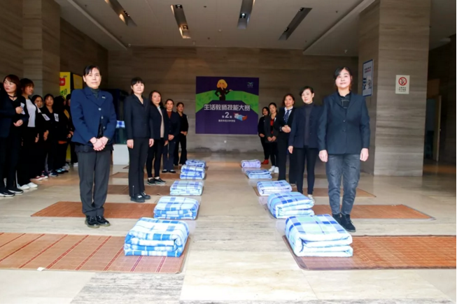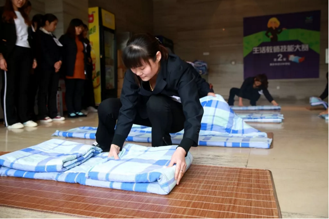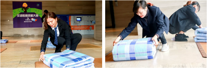 疊被子看似簡單,但真正想要疊得有模有樣其實并不容易,需要日復一日的重復訓練,加之認真嚴謹的行為態度。比賽中,生活老師們手法嫻熟、動作優雅,不一會兒就將被子疊得整整齊齊、棱角分明,他們的專業水平也贏得了現場觀賽師生的連連掌聲。