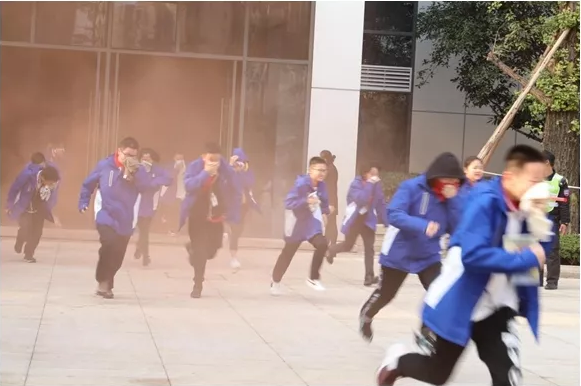 宿舍“著火”了,怎么辦?——伴隨著警報聲響起,同學們用濕毛巾捂住口鼻,迅速而有序的從防火通道口撤離“火災”現(xiàn)場。