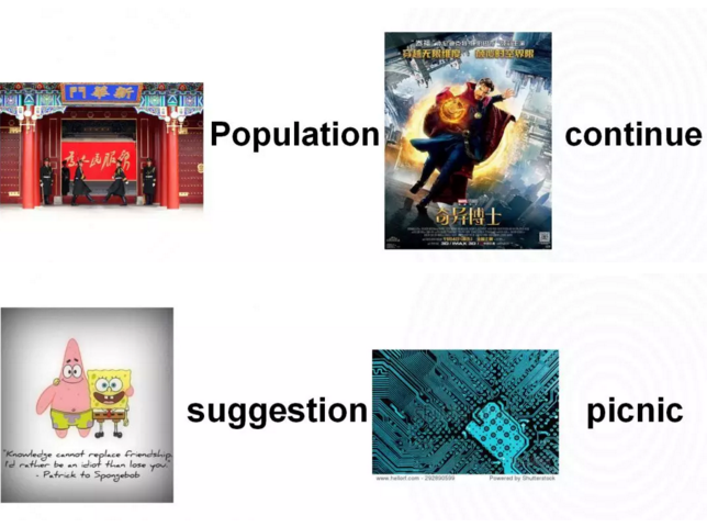 PK賽Let's Say,兩位選手在10秒內(nèi)記憶PPT上的圖片或單詞,按鈴搶答,一旦答錯(cuò),對(duì)手得分。本以為就是考考單詞量、記憶力及反應(yīng)力。可當(dāng)屏幕上出現(xiàn)以下題目: