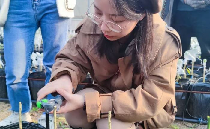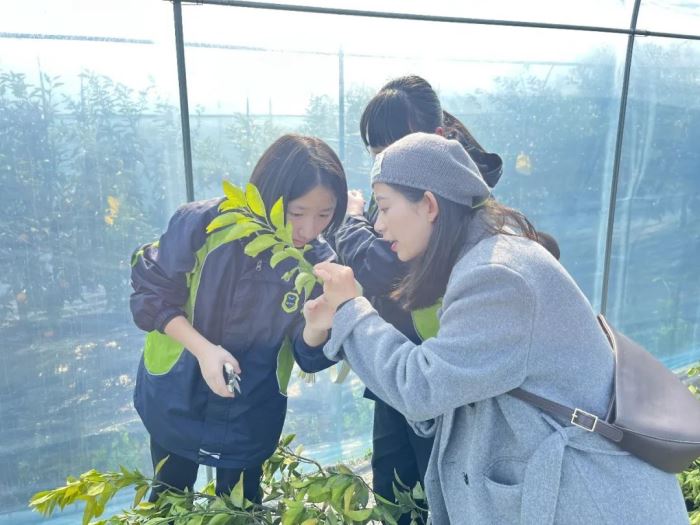 同學們看著長勢正好的果苗、各種不同的嫁接成果欣喜非常,認真地做著記錄。苗圃的專業人員帶領老師和同學們選擇沃柑作接穗,并強調不同生長程度、軟硬、芽生長的狀態、是否健康、如何修剪等等都是選擇接穗必須要思考的問題。