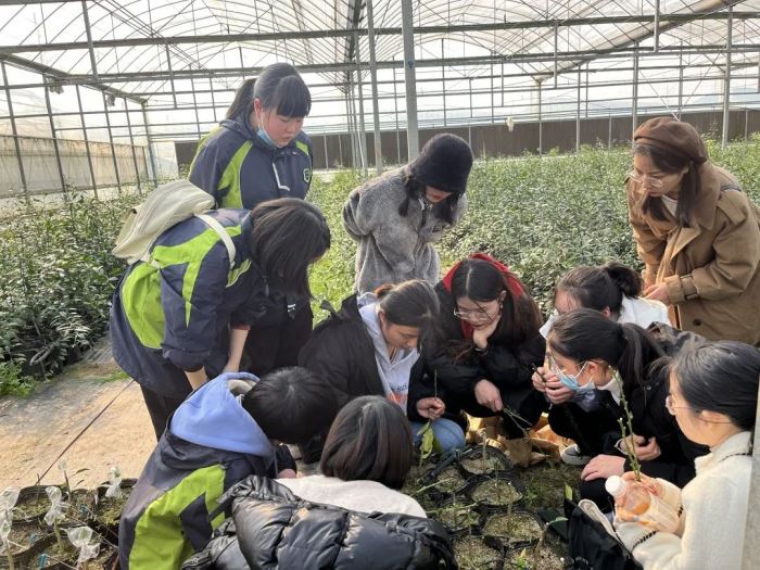 這樣的互動讓羅亞老師突然想到八年級下冊生物課本第一章中《植物的生殖》剛好涉及到這些知識,原來課本上的知識就在身邊,而且正在運用,如果帶上學科組的小伙伴一起來果苗基地做個研學活動,那肯定是很棒的!開學后她和大家一商量,果然一拍即合,隨即在第二個周末就聯系了苗圃的負責人并帶領對生物興趣濃厚的同學一起開啟了這次研學實踐。
