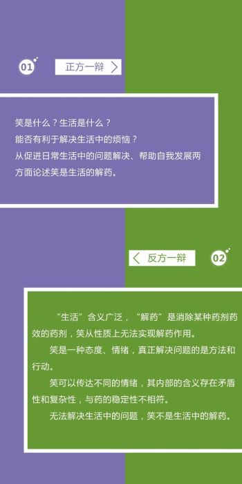 最后,拿到辯題要先分析,一是定義先行,輔以對辯題的理解。這一點來看,反方做得更好一些,一、二、三辯均對此內容有詳細的解釋,特別是反方二辯說笑有“大笑、微笑、苦笑、假笑、嘲笑”等等。第二還要明確一點就是“解藥”在此處是一個形象化的說法,是用的比喻,那么就要從解藥這一喻體出發,知道它的定義,并且由一辯給這個喻體解藥劃定一個范圍。這樣雙方才可以就這個區域內進行攻守上的辯論。