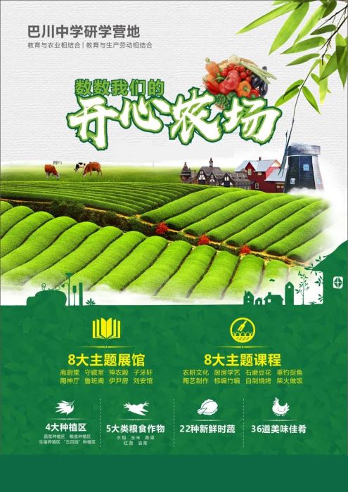 開心農(nóng)場研學(xué)營地面積總計約1500畝,內(nèi)設(shè)蔬菜種植區(qū)、糧食種植區(qū)、生豬養(yǎng)殖區(qū)、五百園(百花、百草、百果、百瓜、百樹)種植區(qū)。蔬菜品種優(yōu)良,純天然綠色無公害,全年種植面積達(dá)到400畝,產(chǎn)量達(dá)到50萬噸;水稻、玉米、高梁種植面積達(dá)350畝,總計13萬噸;年出欄肥豬300頭,嚴(yán)格按照糧食飼養(yǎng)的方法進(jìn)行合理配方養(yǎng)殖;雞、鴨、鵝按照傳統(tǒng)農(nóng)家養(yǎng)殖方式喂養(yǎng),每年產(chǎn)出數(shù)千只供學(xué)校學(xué)生食用。