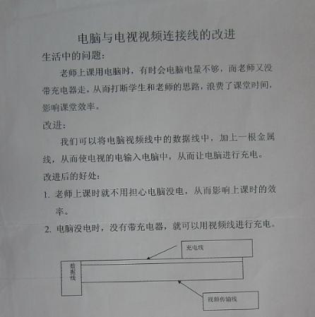 簡要介紹: ????巴川中學2015級6班學生 作品名稱:電腦與電視連接線的改進