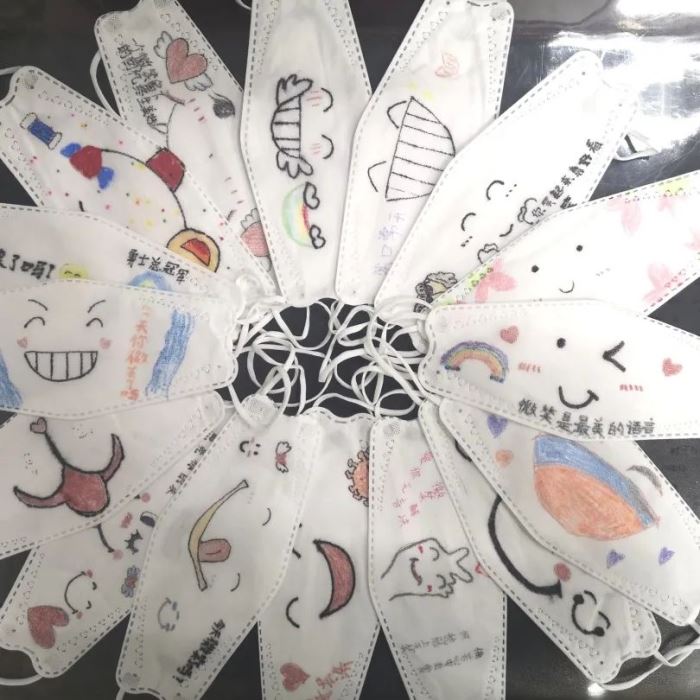 心理健康課上同學們繪制專屬的“微笑”口罩,微笑大使組成微笑小組,將“微笑口罩”贈送給老師、同學、保安叔叔、保潔阿姨,還有食堂的叔叔阿姨和生活媽媽們,幸福的笑容洋溢在他們的臉上,也流淌到同學們的心里。在參與中,同學們更深地感受到微笑是人際溝通最美的語言,即使疫情反撲,也不能讓口罩遮住我們的笑臉。