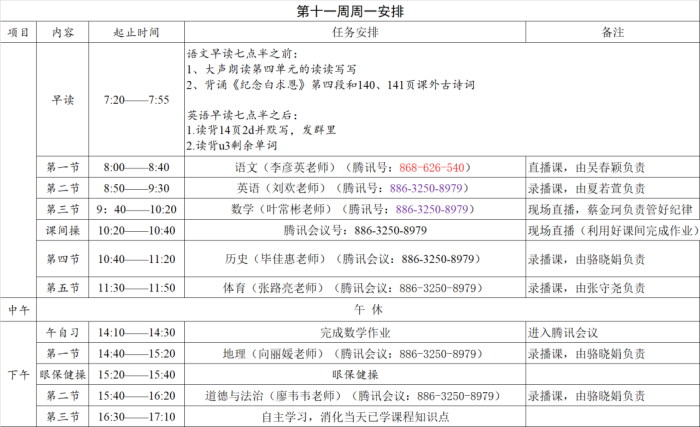 線上教學精細化管理。按照學校的作息時間規劃好每天的在線課程表,各學科在線教學的老師、會議號、配合教師全部安排就緒。