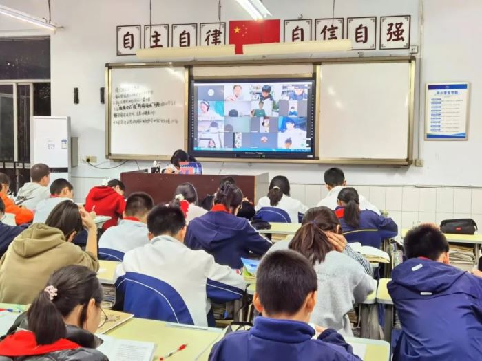 為便于管理,七年級部分班級把走讀生桌椅暫時收起來整齊擺好在教室后面,將住校生重新安排座位,便于老師清點到班情況;所有走讀生居家自習狀態全部呈現在一體機上,做到有序有效。