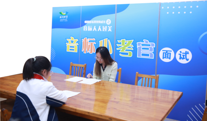 同學們隨機抽取口試試題,準備好后依次到考官處測試。對存在發音問題的同學,小考官會當面指出并予以糾正;對測試合格的同學,會現場頒發音標PASS卡。