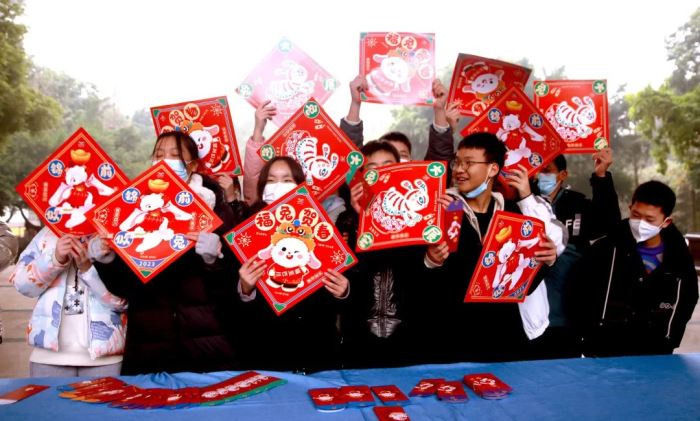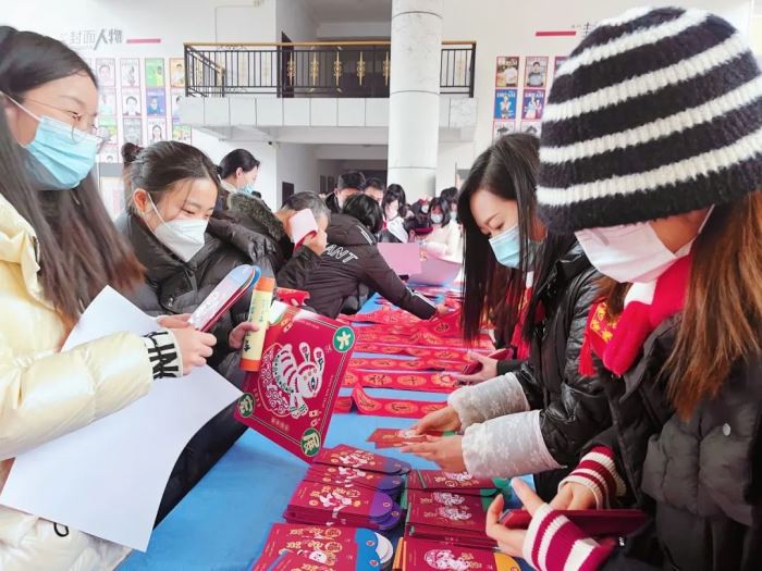 展覽前一周,在美術(shù)學科組的組織下,喜歡書法的老師和同學們積極參與進來,利用課余時間書寫了300余副春聯(lián)和福字,以及學生設計的600多份定制福貼和2000多個紅包贈送給老師和同學們。還有一支送福小分隊,送到身在門崗值班的保安,送到服務教學的部門和年級,將一份份暖心祝福送給辛勤工作中的巴川人。