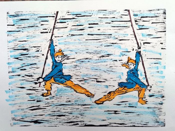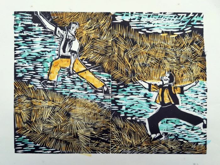 每組6位同學,每名組員完成作品中的一部分,手繪能力強的同學做初稿上版,大家一起商討刻制方法,根據(jù)分工刻制自己負責的部分,刻完后再印制、著色,老師會帶領同學們到展覽現(xiàn)場評價總結(jié)。