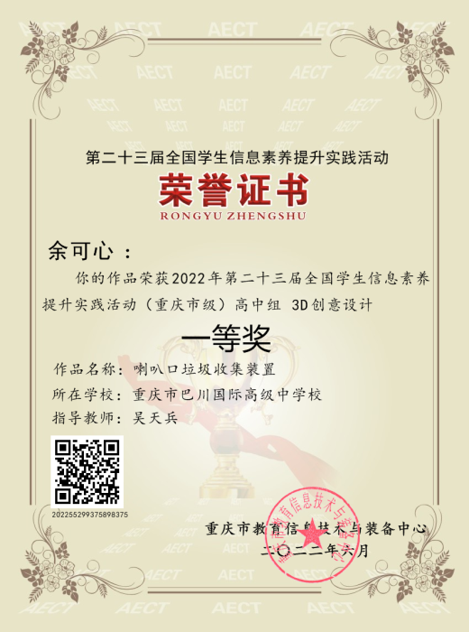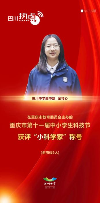 1月30日,重慶市教委通報了重慶市第十一屆中小學生科技節(jié)小科學家、小發(fā)明家、科技小能手評選結果,我校高中部余可心同學被授予“小科學家”榮譽稱號(全市僅9人)。