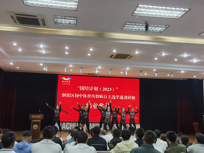 2024年4月23日上午,由重慶市巴川中學校體藝處精心承辦的“國培計劃(2023)”——初中體育坊教師自主選學遞進研修活動,隨著最后一場培訓成果展示的落幕,圓滿地畫上了句號。結業典禮上,重慶市教育科學研究院體育教研員屈明老師、重慶市銅梁區教師進修學校李奕奕校長、重慶市銅梁區教師進修學校教師發展部副主任宗和艷女士,銅梁區教師進修學校體育教研員 ????????蘇醒老師以及重慶市巴川中學校校長蔣揚勇,副校長夏顯東等重量級嘉賓齊聚一堂,共同見證了這精彩一幕。來自銅梁區體育教研中心組的各位成員和國培計劃(2023)銅梁區初中體育坊的全體學員也參與了此次典禮。