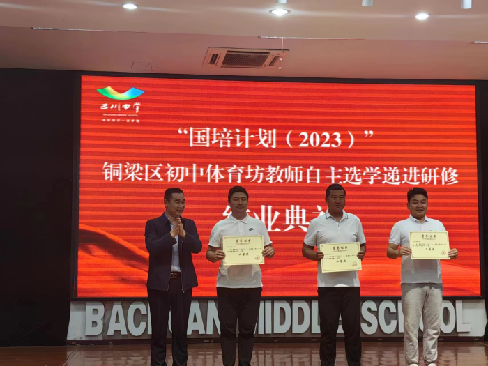 結業儀式以優質課成果展示、專題培訓、結業典禮三個部分組織,優質課成果展示由小班學部七年級王鳳嬌老師給大家展示了一堂三研三磨的精品課《籃球-傳切配合的學練與實戰運用》以及小班學部八年級盧宗其老師給大家帶來的《實心球》教學,讓大家通過現場觀摩更直觀的了解新課改下的體育與健康課堂教學改革。結業儀式上教科院屈明老師給大家主講了一堂《新課標視閾下體育與健康課堂教學改革》的專題培訓。結業典禮以一段輕松愉悅的舞蹈暖場,歡迎各位嘉賓和老師的蒞臨,巴川中學體藝處主任助理沈潔老師主持了本次典禮。一個教師最好的狀態就是不斷地沉淀自己,靜下心來學習和思考,持續地努力和探索,重慶市巴川中學校張路亮老師作為青年教師代表為大家分享了他的研修學習經歷和成長故事。一幀幀鏡頭翻閱劃過,生動記錄、定格了每一個精彩瞬間,學員們再次一同重溫了核心團隊組建,專家引領,三研三模,優質課展示等精彩時刻。當7天的朝朝暮暮重現,過往點點滴滴浮現心間,感動油然而生,這段美好的回憶已不覺凝結成時間的美好、動人,在每個人的記憶中閃閃發光。巴川中學體藝處主任吳波主任進行了國培研修的總結,誠摯寄語,殷殷囑托,希望老師們繼續更新教育理念,拓寬視野眼界,提升教學技能,豐富教學經驗,為巴川高效體育課堂的打造進一步夯實基礎。也希望大家學以致用,充分發揮骨干教師在教育教學中的示范引領和輻射帶動作用,助力我區體育教育高質量發展。一分耕耘,一分收獲。學習的過程中涌現出一批優秀的國培學員。吳波主任組織了頒獎,與會領導為優秀個人和優秀團隊頒發榮譽證書。鼓勵大家在接下來的工作與學習中繼續努力,不斷提升。