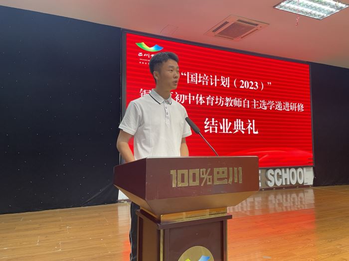 結(jié)業(yè)儀式以優(yōu)質(zhì)課成果展示、專題培訓(xùn)、結(jié)業(yè)典禮三個部分組織,優(yōu)質(zhì)課成果展示由小班學(xué)部七年級王鳳嬌老師給大家展示了一堂三研三磨的精品課《籃球-傳切配合的學(xué)練與實(shí)戰(zhàn)運(yùn)用》以及小班學(xué)部八年級盧宗其老師給大家?guī)淼摹秾?shí)心球》教學(xué),讓大家通過現(xiàn)場觀摩更直觀的了解新課改下的體育與健康課堂教學(xué)改革。結(jié)業(yè)儀式上教科院屈明老師給大家主講了一堂《新課標(biāo)視閾下體育與健康課堂教學(xué)改革》的專題培訓(xùn)。結(jié)業(yè)典禮以一段輕松愉悅的舞蹈暖場,歡迎各位嘉賓和老師的蒞臨,巴川中學(xué)體藝處主任助理沈潔老師主持了本次典禮。一個教師最好的狀態(tài)就是不斷地沉淀自己,靜下心來學(xué)習(xí)和思考,持續(xù)地努力和探索,重慶市巴川中學(xué)校張路亮老師作為青年教師代表為大家分享了他的研修學(xué)習(xí)經(jīng)歷和成長故事。一幀幀鏡頭翻閱劃過,生動記錄、定格了每一個精彩瞬間,學(xué)員們再次一同重溫了核心團(tuán)隊(duì)組建,專家引領(lǐng),三研三模,優(yōu)質(zhì)課展示等精彩時刻。當(dāng)7天的朝朝暮暮重現(xiàn),過往點(diǎn)點(diǎn)滴滴浮現(xiàn)心間,感動油然而生,這段美好的回憶已不覺凝結(jié)成時間的美好、動人,在每個人的記憶中閃閃發(fā)光。巴川中學(xué)體藝處主任吳波主任進(jìn)行了國培研修的總結(jié),誠摯寄語,殷殷囑托,希望老師們繼續(xù)更新教育理念,拓寬視野眼界,提升教學(xué)技能,豐富教學(xué)經(jīng)驗(yàn),為巴川高效體育課堂的打造進(jìn)一步夯實(shí)基礎(chǔ)。也希望大家學(xué)以致用,充分發(fā)揮骨干教師在教育教學(xué)中的示范引領(lǐng)和輻射帶動作用,助力我區(qū)體育教育高質(zhì)量發(fā)展。一分耕耘,一分收獲。學(xué)習(xí)的過程中涌現(xiàn)出一批優(yōu)秀的國培學(xué)員。吳波主任組織了頒獎,與會領(lǐng)導(dǎo)為優(yōu)秀個人和優(yōu)秀團(tuán)隊(duì)頒發(fā)榮譽(yù)證書。鼓勵大家在接下來的工作與學(xué)習(xí)中繼續(xù)努力,不斷提升。