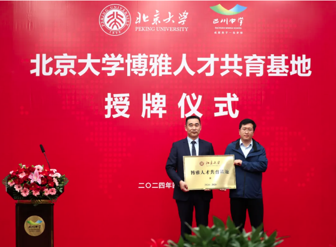 2024年4月19日上午10時,重慶市巴川中學舉行北京大學博雅人才共育基地授牌儀式。北京大學招生辦公室副主任熊光輝,北京大學重慶招生組組長郭超,重慶市人民政府參事、中國教育學會副會長黃政,國家督學、重慶市教育學會會長鐘燕,銅梁區人民政府副區長陳慶華,銅梁區委教育工委書記、區教委主任唐建民,銅梁區教育學會會長田益等領導以及師生家長代表共100余人參會。