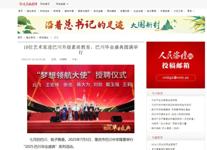 新華社、國際在線、中新網、中國日報網等央媒特別提到蔣大為、張也等藝術家與學子同臺的音樂品鑒會,展現了“校園美育浸潤行動”的創新舉措,同時巴川二十年優秀的育人成果,被央媒譽為“素質教育的雙贏樣本”。