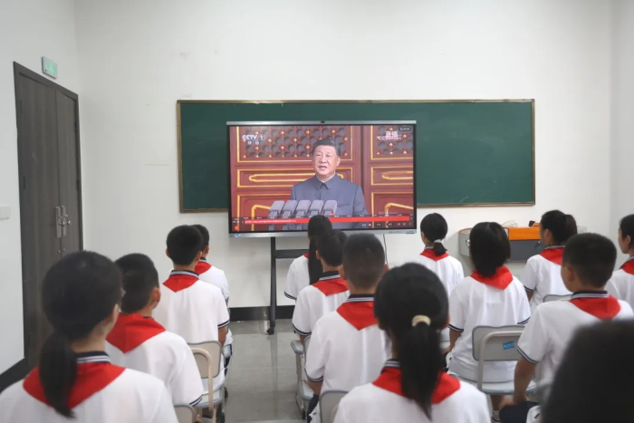 老師們借助視頻、圖片和數據,將曾經的烽火歲月與國家今日之強盛清晰連接,在學生心中埋下思考的種子,為次日集體觀看做足精神“熱身”。